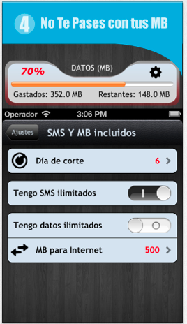 Para iPhone tenemos varias apps que nos pueden medir nuestro consumo de datos, pero la que nosotros preferimos es «No me paso», lo primero es que esta en español, y nos permite llevar el control del consumo de datos, mensajes y minutos, así mismo incluye la alerta de los 4:30 minutos para los números que tenemos como gratuitos.
