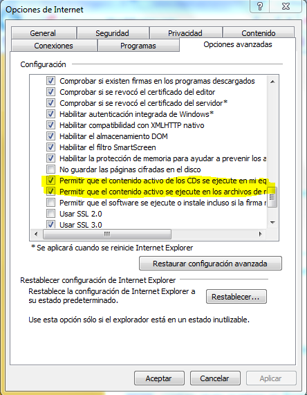 Como vemos en la imagen, entramos a la ventana de «Opciones de internet», en ella buscamos la pestaña de «Opciones avanzadas» y lo que debemos hacer es marcar las dos casillas que se ven la imagen, honestamente no sabemos el porque estas casillas solucionan el problema porque una se refiere a la ejecución de contenido flash presente en los CD intearctivos y la otra es para los archivos flash que están físicamente en nuestro equipo.