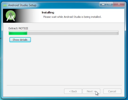 Ahora ejecutaremos el instalador del Android Studio, que tardara unos segundos en cargar, para que aparezca la ventana en donde nos indicara que se instalara, el entorno de desarrollo, el SDK de Android y los emuladores o dispositivos virtuales Android, aquí haremos clic en Next.