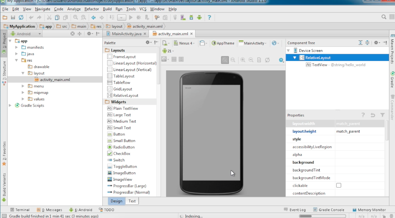 Como es la primera ejecución del Android studio al llegar al entorno de trabajo, le tomara unos minutos hacer el renderizado de la vista previa y cargar todo lo necesario, así que hay que ser paciente.