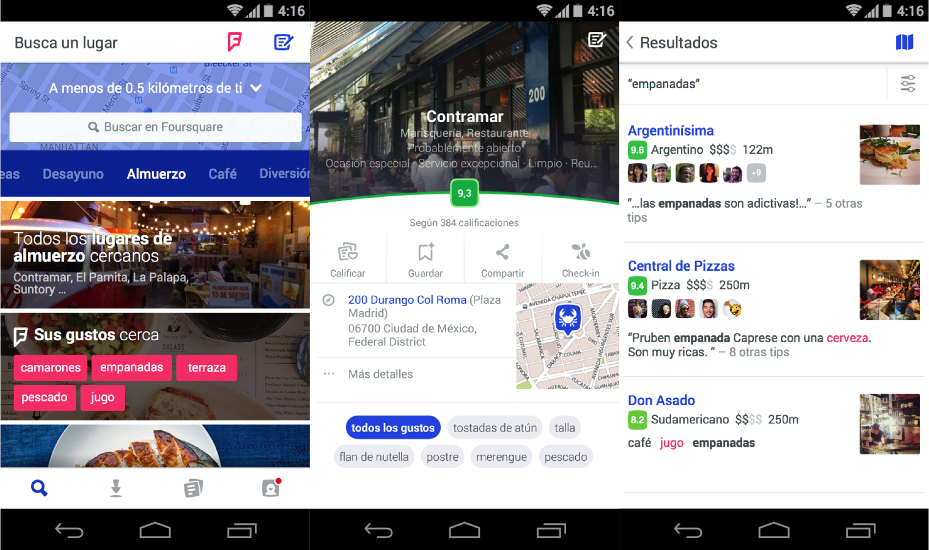 En ella podemos buscar y descubrir lugares de nuestro interés y que estén cerca de nuestra ubicación. Podemos buscar restaurantes, cafés, tiendas departamentales, antros, etc., simplemente ingresamos un término de busqueda y Foursquare se encarga de realizarla, podemos incluso buscar utilizando términos como: «comida mexicana», “tequila”, así como definir por precios para así descargar los que estén fuera de nuestro presupuesto o si estamos sobrados buscar los caros XD.