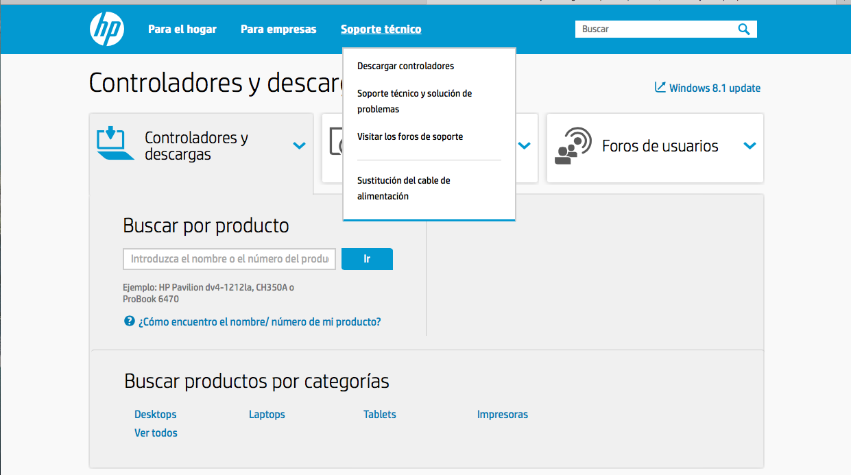 Para obtener los controladores de nuestra computadora, la forma mas segura es a través de la pagina de soporte del fabricante de nuestra computadora, en ella solo deberemos indicar el modelo de nuestro equipo como se muestra en la siguiente imagen
