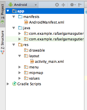 - java: En esta carpeta en forma de paquetes podemos encontrar el archivo MainActivity.java, el cual contendrá el código principal de nuestra app, en este misma carpeta colocaremos los demás archivos java que necesitaremos para crear la lógica de nuestra app.