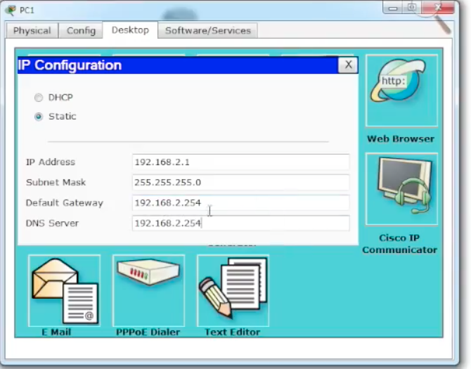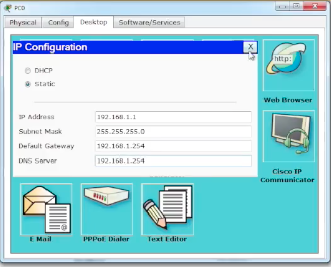 En este punto debemos entender que estamos creando 3 redes, dos de ellas van del router hasta la PC de la red que corresponde y la tercera red es la formada por los routers en su conexión a través de Frame Relay, ahora bien, en este caso configuramos cada PC, y debemos anotar cual es la dirección IP del gateway correspondiente a esa red, ya que esa dirección IP será la de la interfaz fastethernet del router que conecta con el switch.