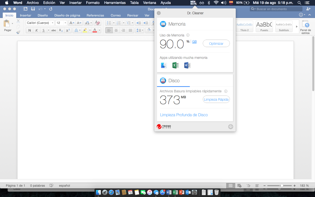 Este descubrimiento comenzó hace unas semanas atrás cuando comenzamos a notar como nuestro equipo MacBook Pro le daba por sobre calentarse, notándose el calentamiento aun en oficinas con clima, estábamos empezando a creer que algo andaba mal en su hardware, pero esto se daba aún mas cuando estaba trabajando con varios documentos de Office a la vez, por lo que decidimos revisar e instalar una App que monitorea el uso de la memoria RAM y el espacio en Disco en busca de archivos temporales para optimizar el sistema Dr. Cleaner disponible en la App Store.