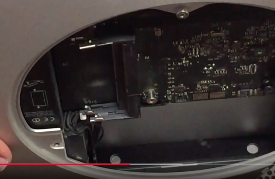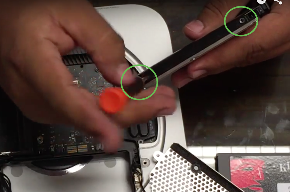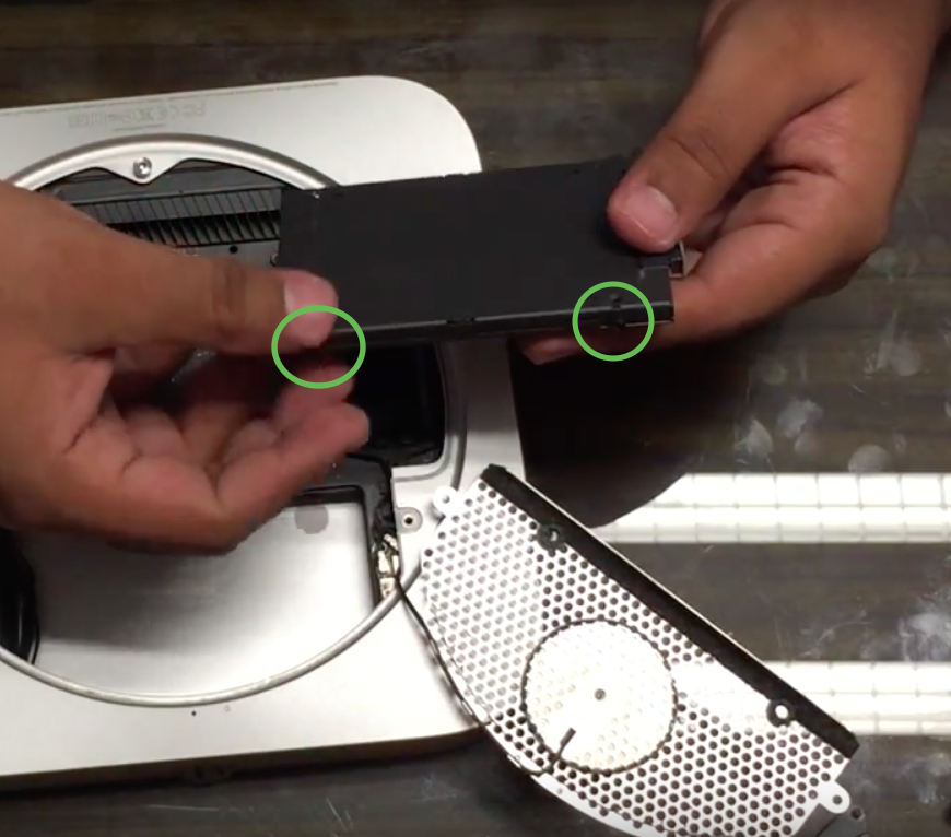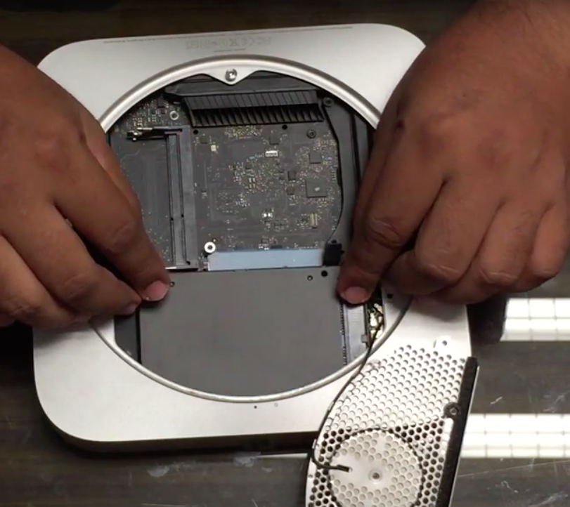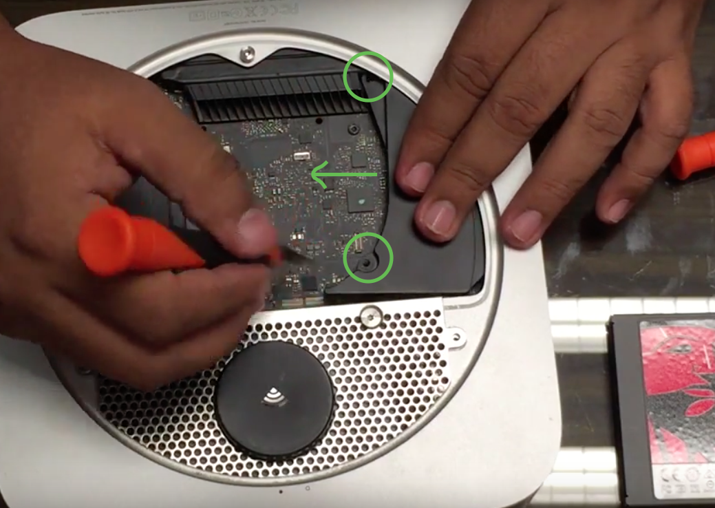 Ahora para colocar en los soportes internos el disco SSD, dado que es mas delgado,puede resultar algo laborioso, para ello colocaremos una tarjeta cualquiera en la ranura que esta dentro del mac mini y que se aprecia ligeramente en la imagen