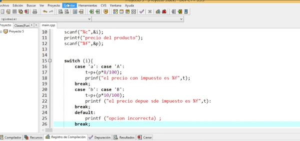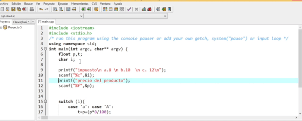 Suponiendo como ejemplo un programa que puede cargar tres diferentes impuestos al precio de un producto, vemos que en la línea 7, definimos la variable «i» de tipo char, pues es uno de los tipos de datos que soporta la estructura; en la línea 15 vemos inicio de la estructura switch en donde la variable a a evaluar se coloca entre paréntesis y se abre una llave en donde se encerrarán todas las opciones y bloques de código que se ejecutarán para cada valor de «i», lo cual vemos más claramente en la siguiente imagen.