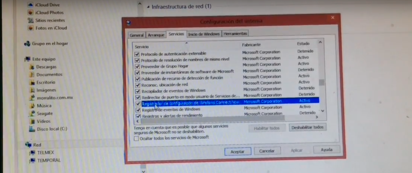Lo que haremos sera entrar al msconfig y en la pestaña de servicios buscaremos el «Registrador de Configuración de Windows Connect Now», lo desactivaremos y guardaremos los cambios.