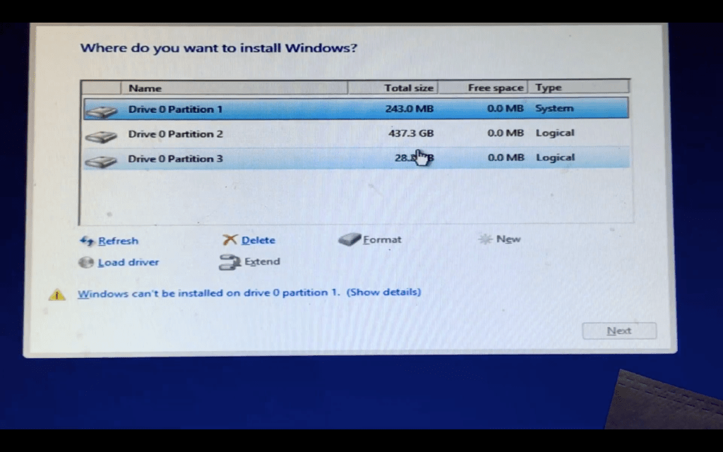 Obviamente pasaremos por todas las ventanas del instalador, hasta llegar a la del disco, en donde componemos ver, se esta usando particiones heredadas, por lo que estas no nos van a servir y tendremos que eliminarlas todas, para crear las nuevas