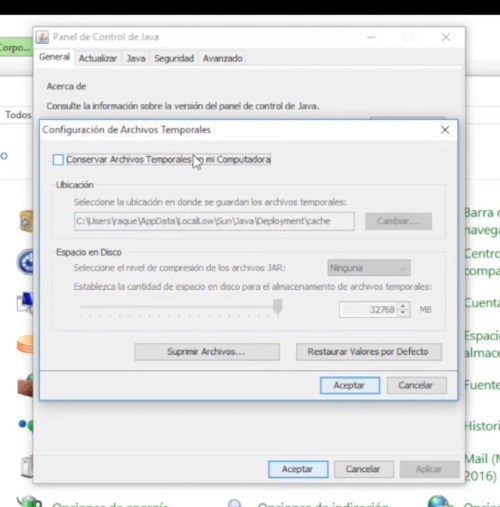 Lo primero sera en la pestaña general hacer clic en configurar y desmarcar la opción, «Conservar arachivos temporales», asi mismo haremos clic en la opcion suprimir archivos, para que cualquier temporal de ajva que hayamos tenido de algun intento de acceso al IMSS previo se elimine. Cerramos la ventana .