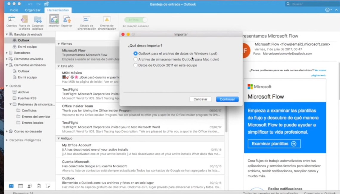 En este momento, cargamos el respaldo con la opción importar , así que seleccionaremos el respaldo y esperaremos a que cargue, una vez que termina de cargar, lo cual no es mucho veremos que el correo esta en una carpeta en nuestro Equipo, pero en realidad lo que queremos es que este en nuestra cuenta de Outlook, para que lo tengamos disponible donde estemos.