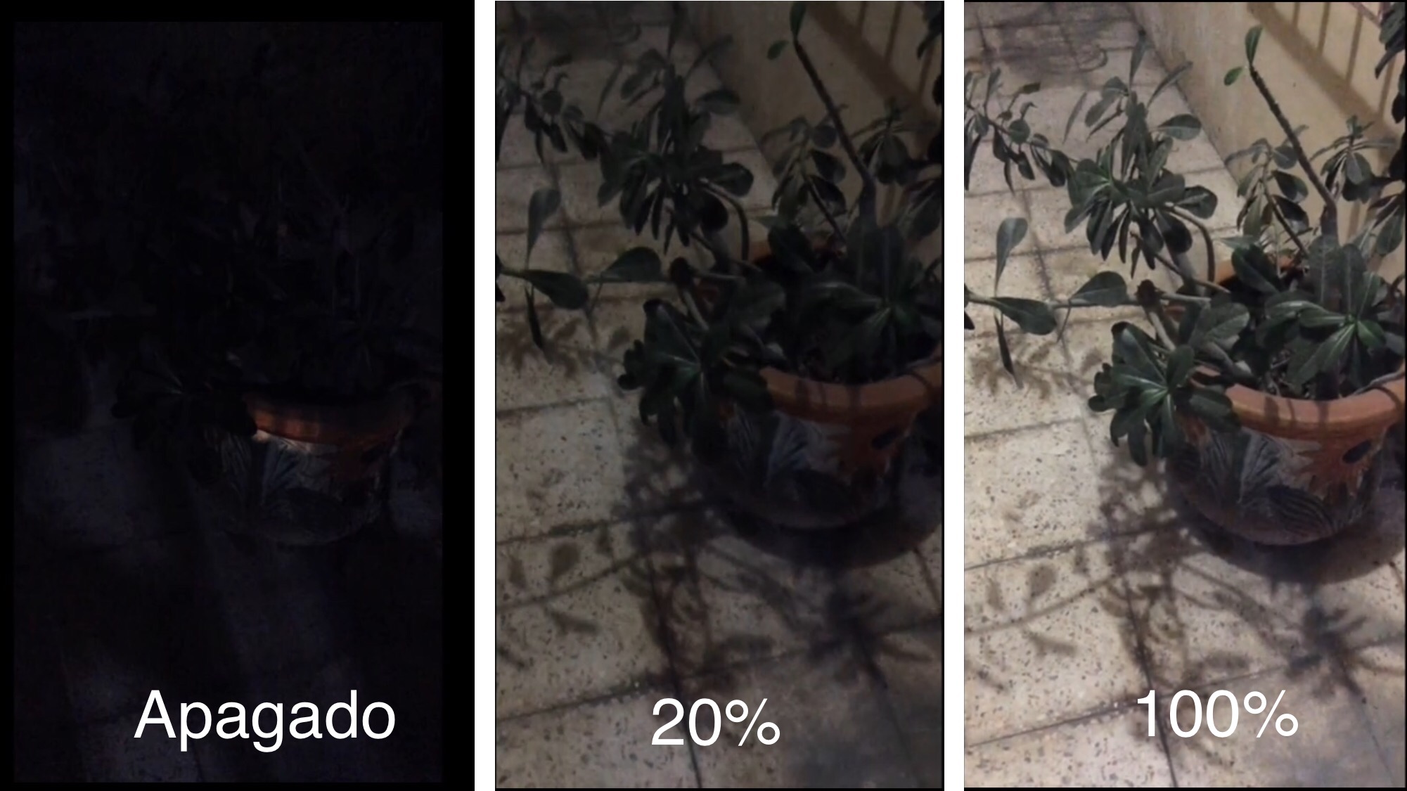 Los dos focos, son focos led de luz blanca, con un consumo de 9 Watts cada uno y con una capacidad de iluminación de 800 lúmenes, la intensidad de la luz se puede graduar desde la app, pero esa cantidad poco le dice a una persona sobre su capacidad de iluminación, por lo que en la siguiente imagen veremos como ilumina uno solo de los focos de noche.