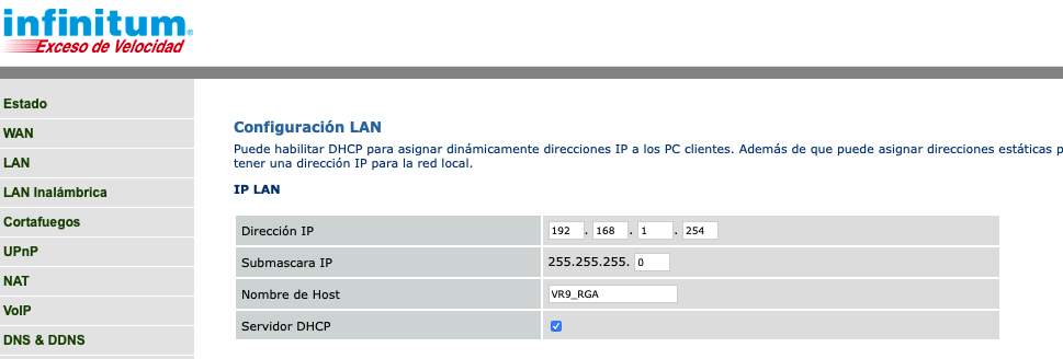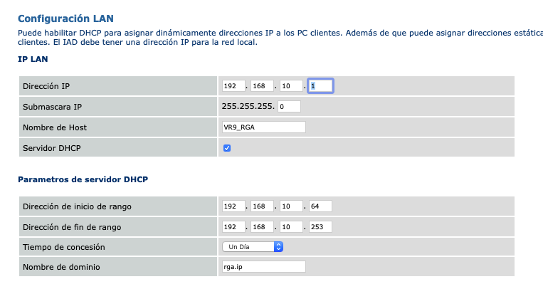 Ya que estamos en la configuración del modem, podemos no solo cambiar la IP del Modem, podemos también cambiar el rango de direcciones IP de toda la red, por lo que, en términos simples, lo que podemos hacer es cambiar el tercer numero de la dirección IP del modem y verificar que en la configuración DHCP se actualice al mismo rango