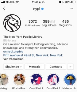 De momento si les interesa, seria una excelente y entretenida forma de practicar las habilidades lectoras del idioma ingles, por lo que los invitamos a darse una vuelta por el Instagram «nypl» de la biblioteca publica de Nueva York