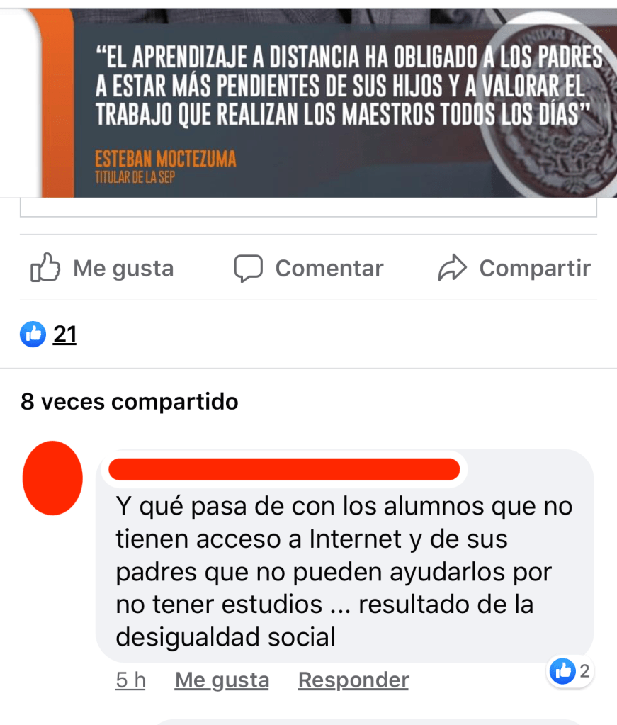 Es claro que la situación que hoy vivimos es excepcional e inaudita, también es claro que las diferencias entre las distintas comunidades lo son, no es lo mismo una escuela en una zona urbana que una escuela en una zona rural, lo cual era evidente, porque se indicó a los docentes que proveyeran educación a distancia, es decir, estaba claro que no todos podrían usar internet, simplemente porque no todos cuentan con este servicio.
