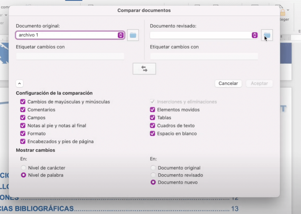 En la ventana que se nos presenta, seleccionaremos los dos archivos a comparar, en este caso, es indistinto cual consideremos el documento original y cual la copia.