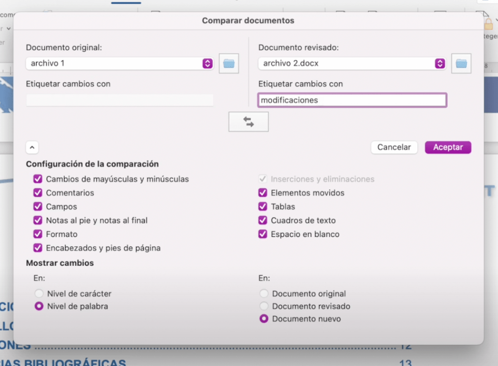 La opción etiquetar cambios, nos permite darle una frase o palabra con la cual se marcaran las diferencias entre los documentos.