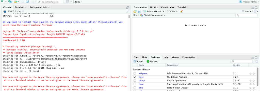 Por alguna razón aunque Rstudio trata de descargar el compilador para instalarlo, no lo hace, por lo que nos toca en este caso es instalar Xcode directamente de la AppStore