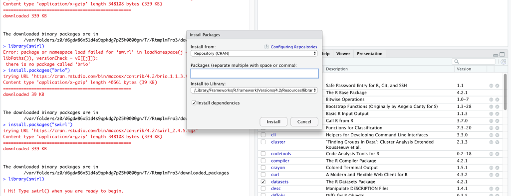 Swirl es un curso interactivo que se puede instalar en Rstudio para ayudarnos a aprender mas sobre el lenguaje de programación R, pero en ocasiones su instalación se puede complicar, sobre todo en macOS, por lo que veremos como solucionar este problema.