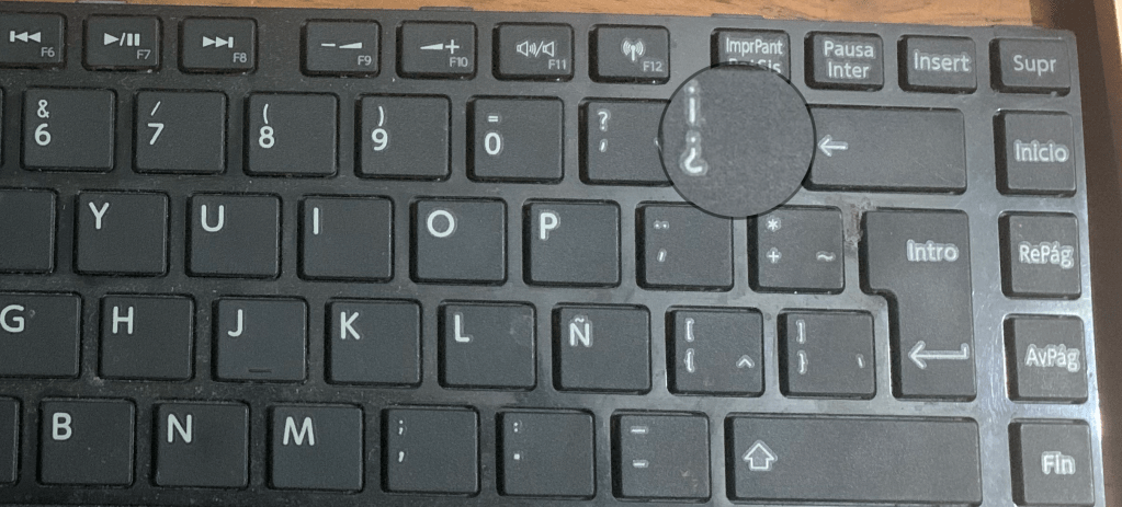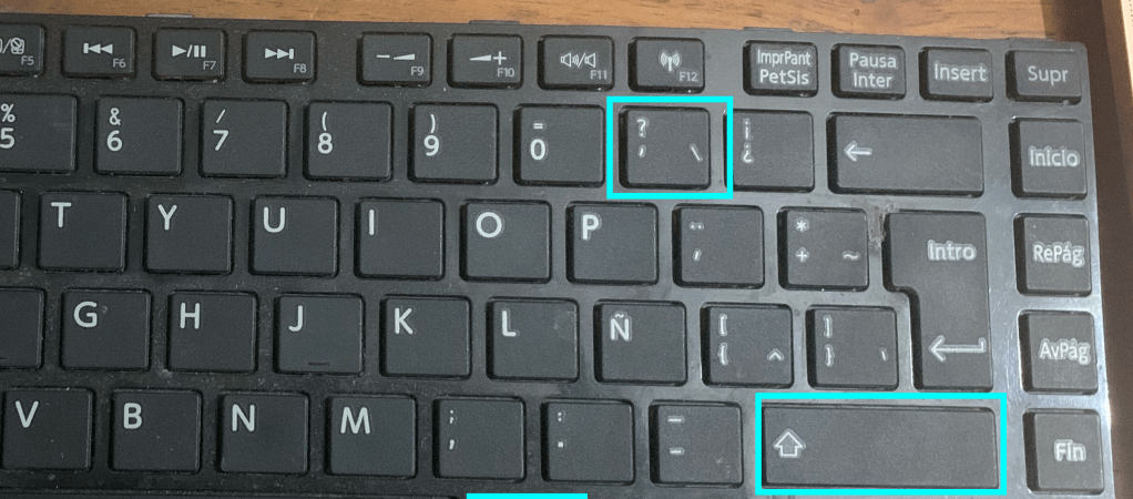 Para el signo de interrogación de cierre «?», debemos combinar la tecla de shift con la tecla que tiene el símbolo.